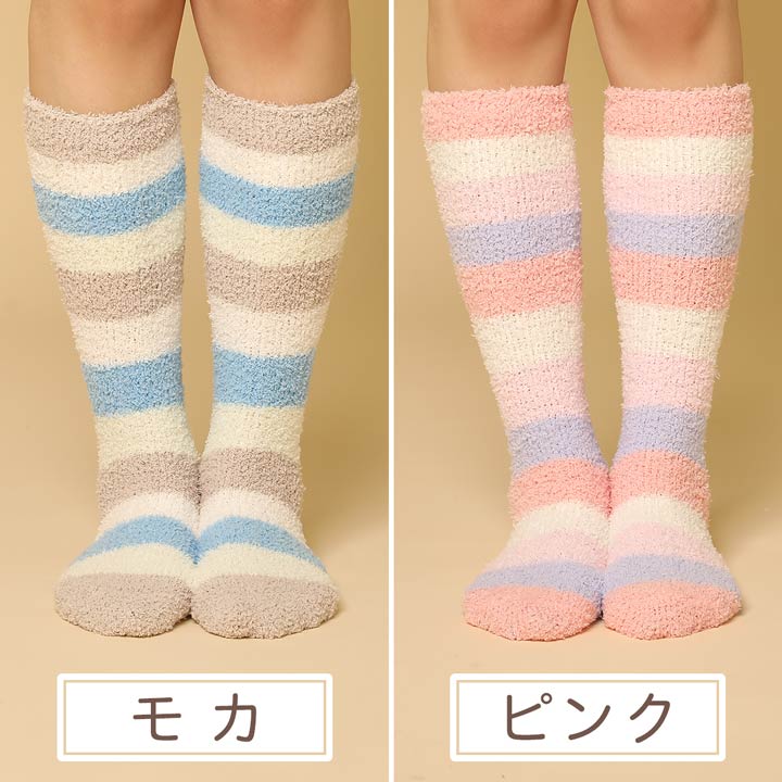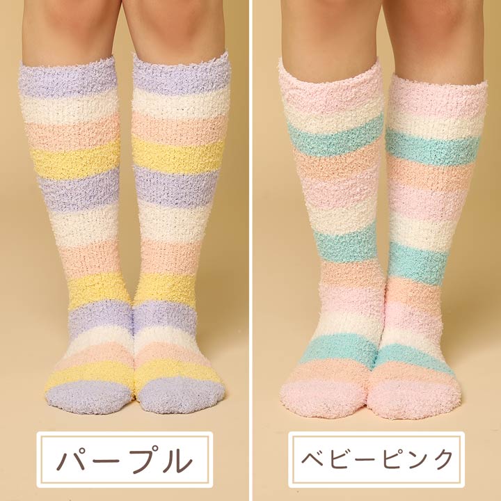 【商品説明】 キュートなカラフルなボーダー柄のロング丈の軽くてふんわり柔らかいもこもこ靴下です!!ロング丈でふくらはぎまでもこもこフワフワで気持ちよく、優しいはき心地です。